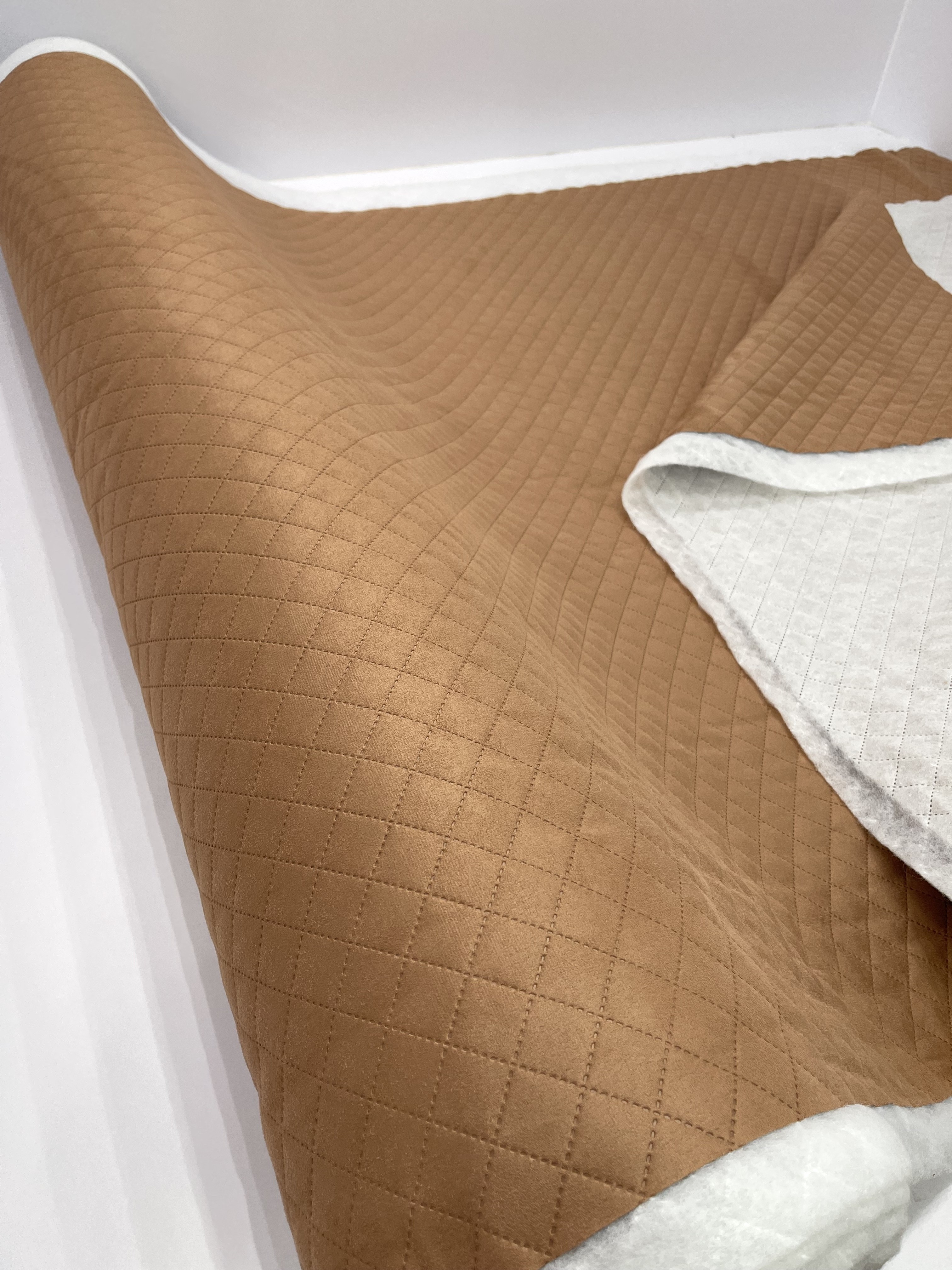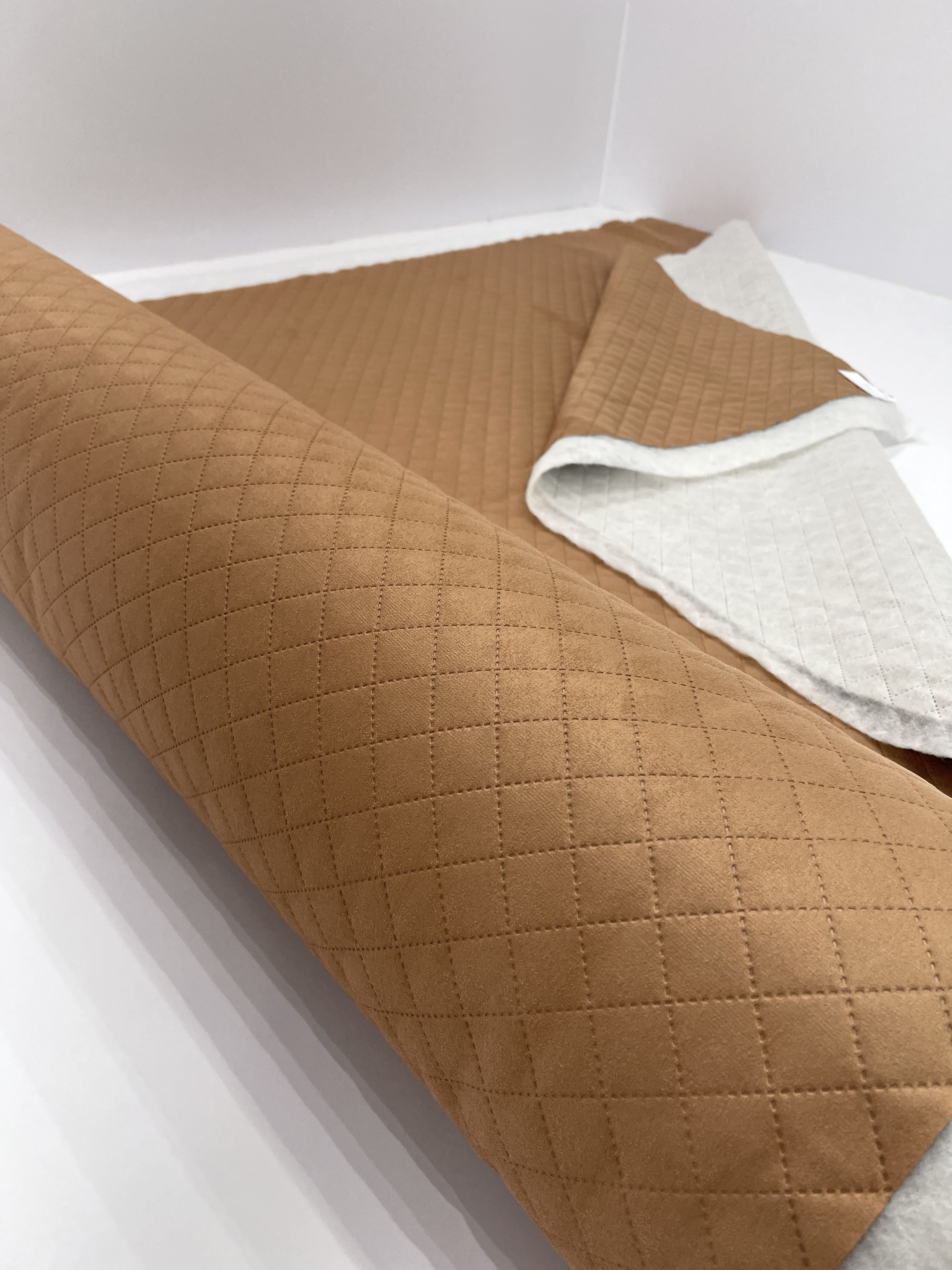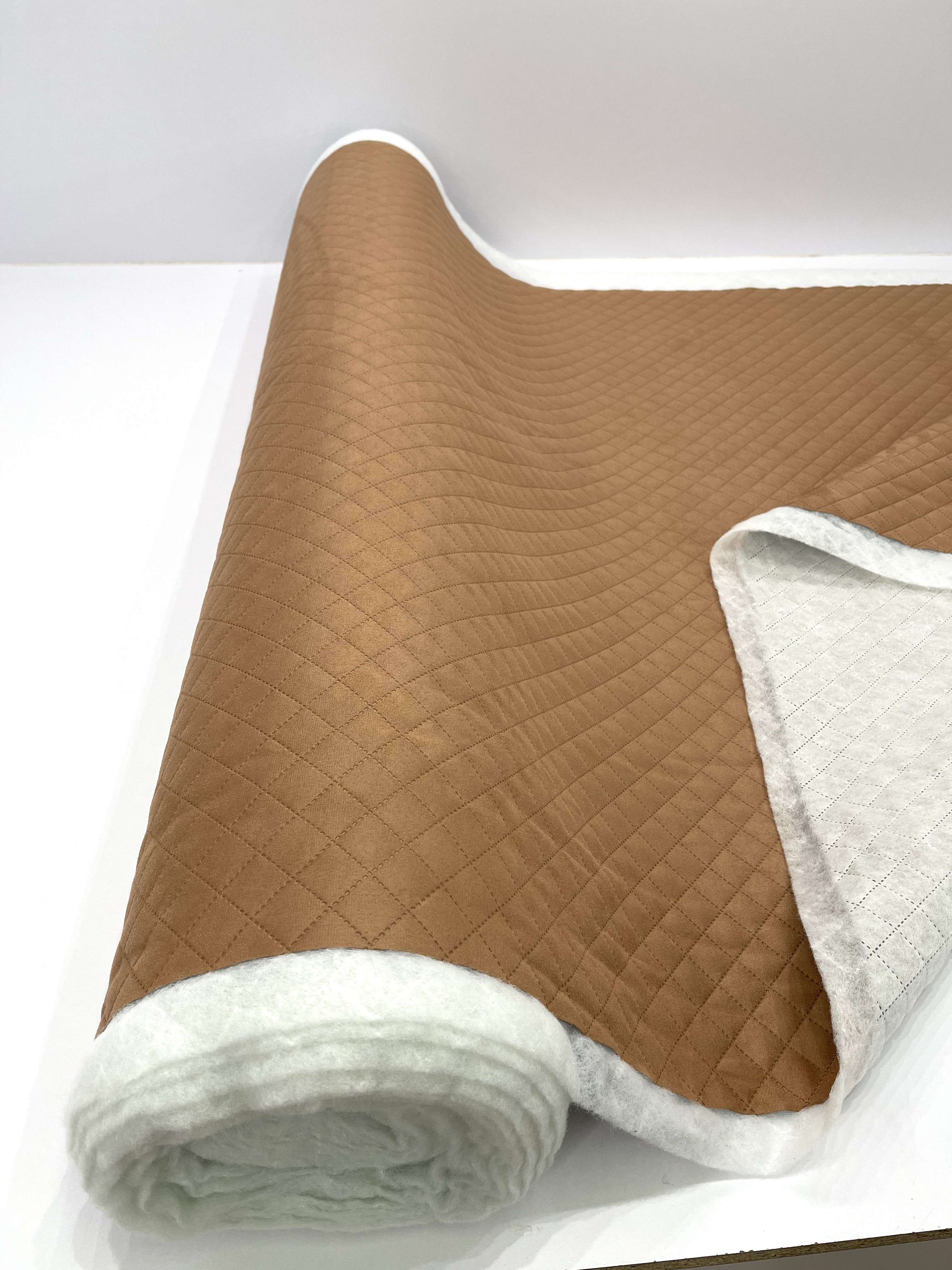 Tkanina obiciowa ALCALA Jasno brązowa to wyjątkowo przyjemny w dotyku materiał tapicerski, pikowany w romby 3x3 cm techniką ultradźwiękową (bez nici) na ocieplaczu tapicerskim o gramaturze 100 g/m².