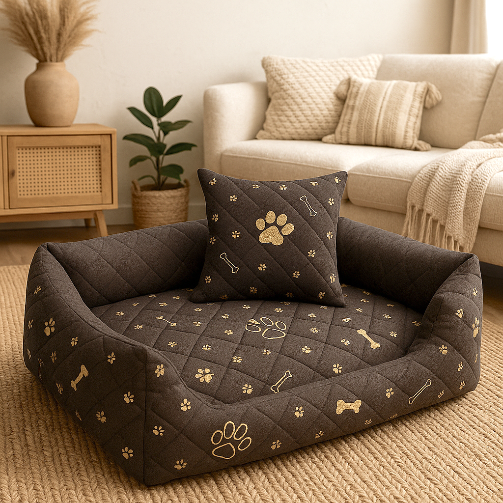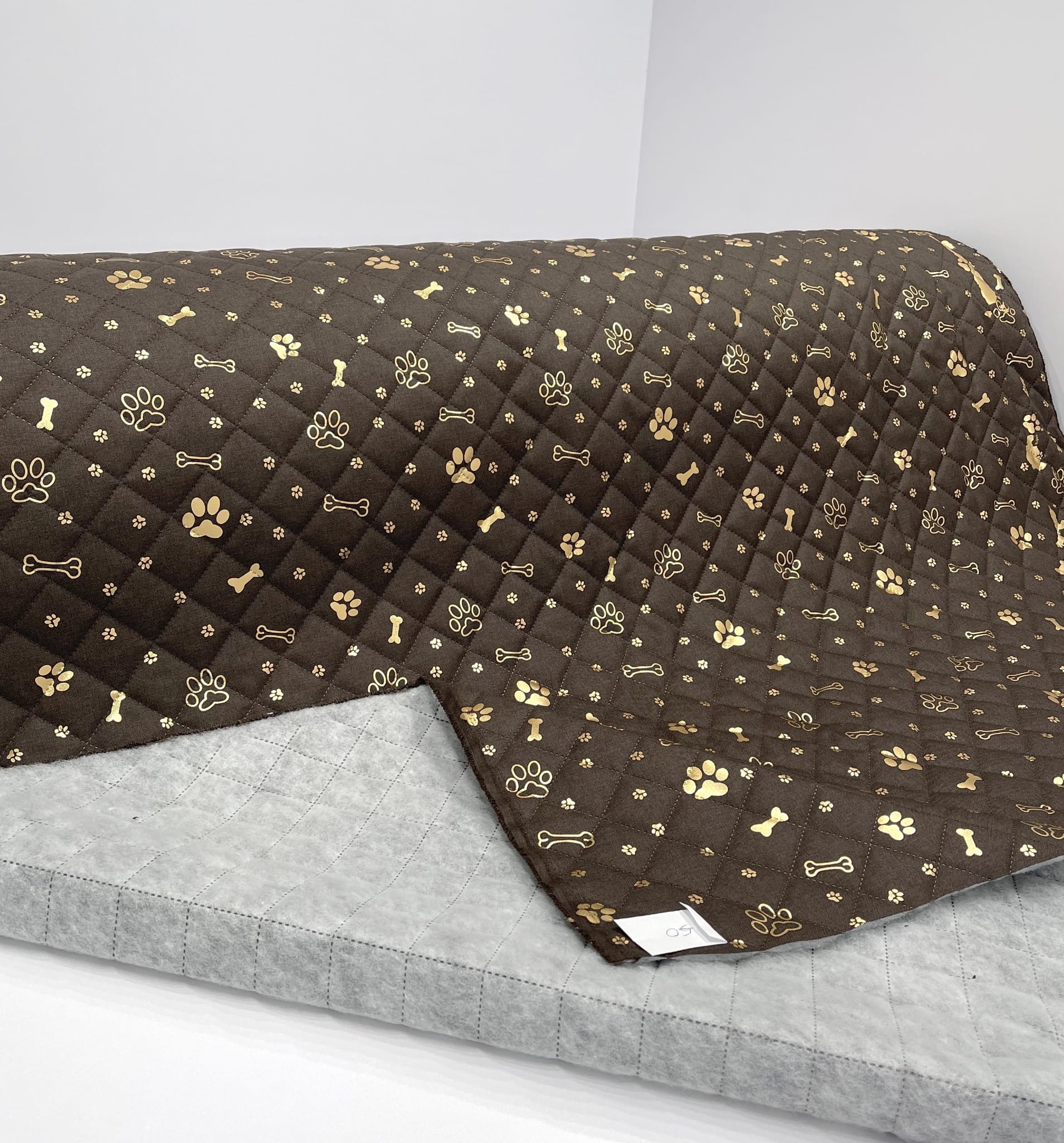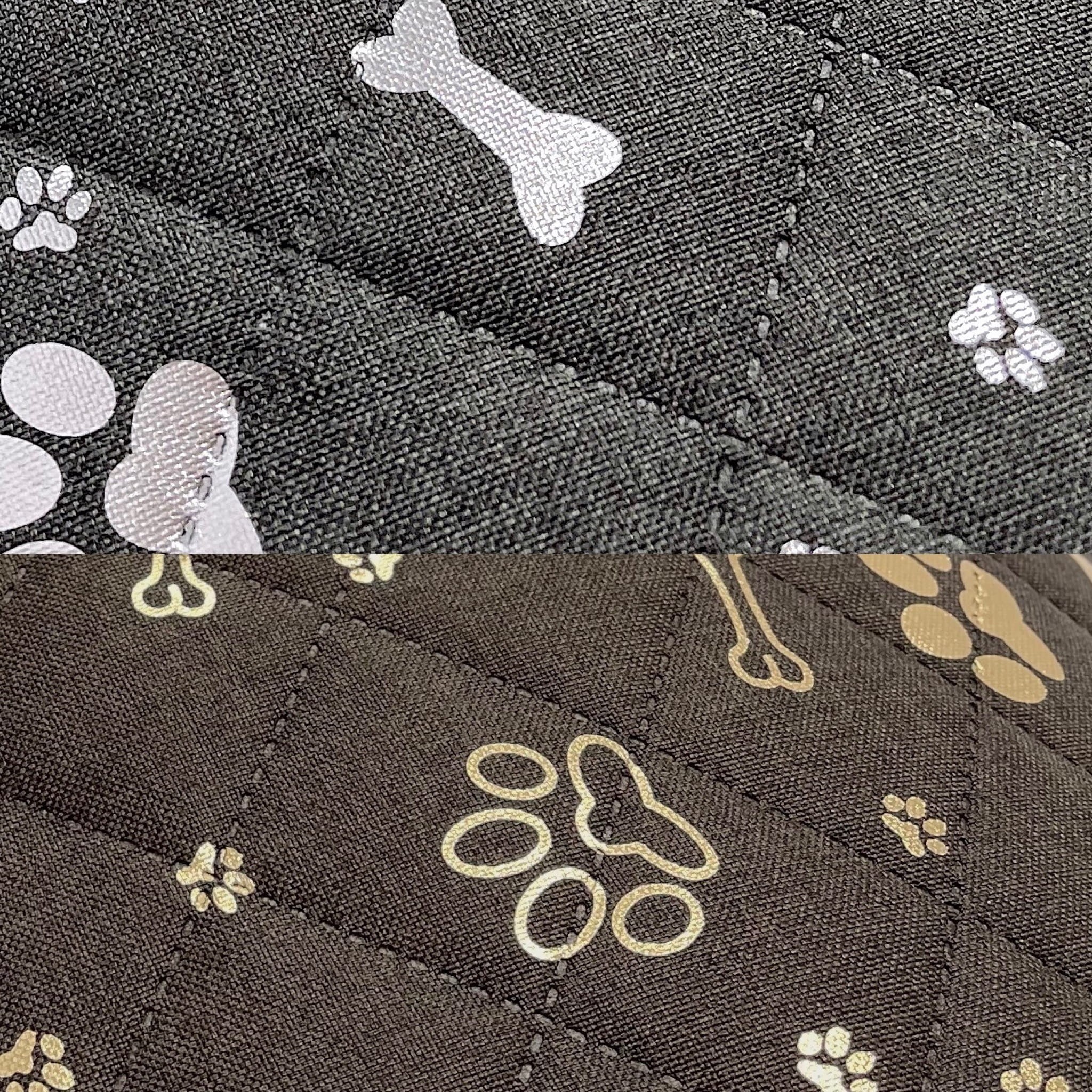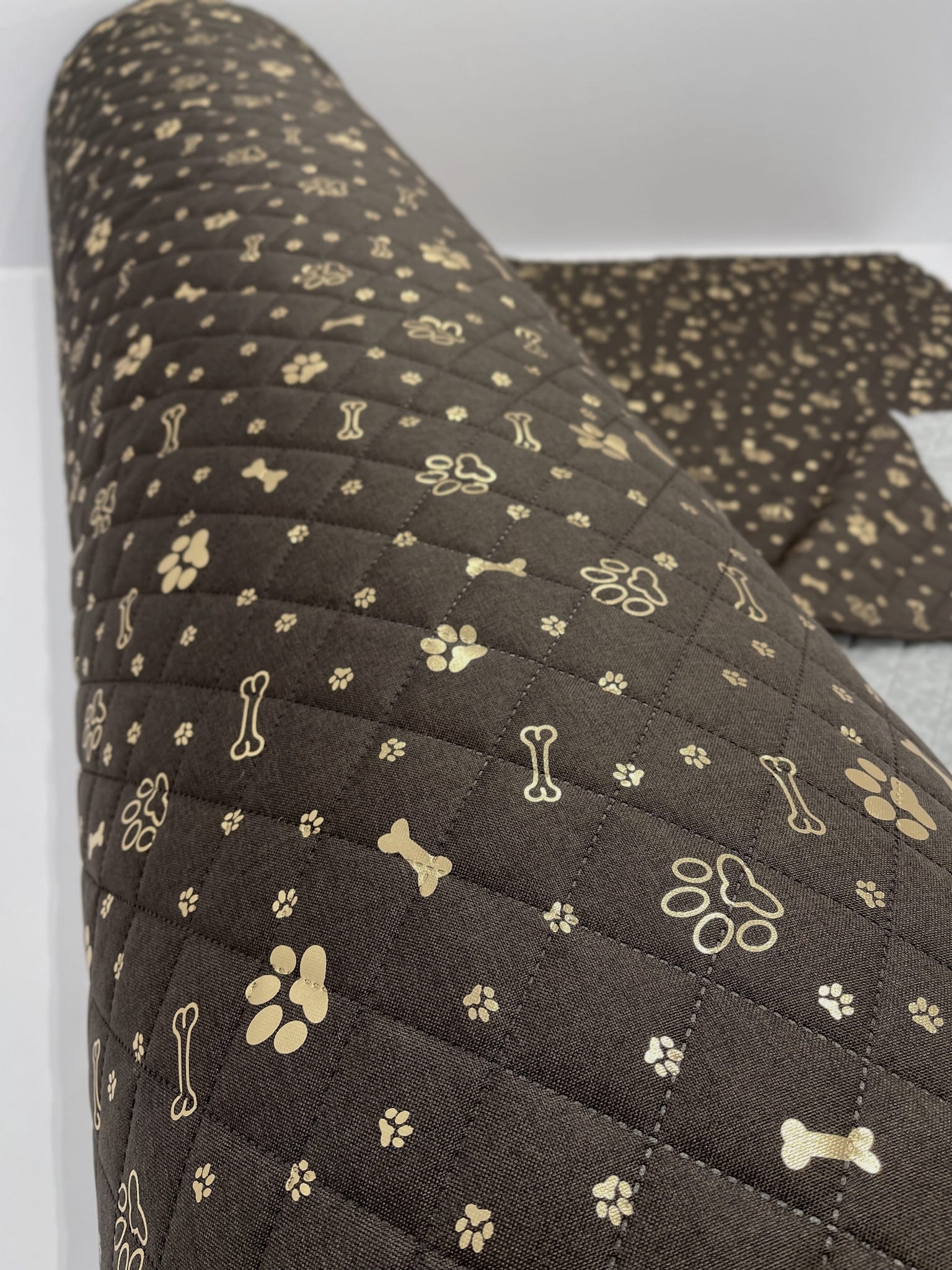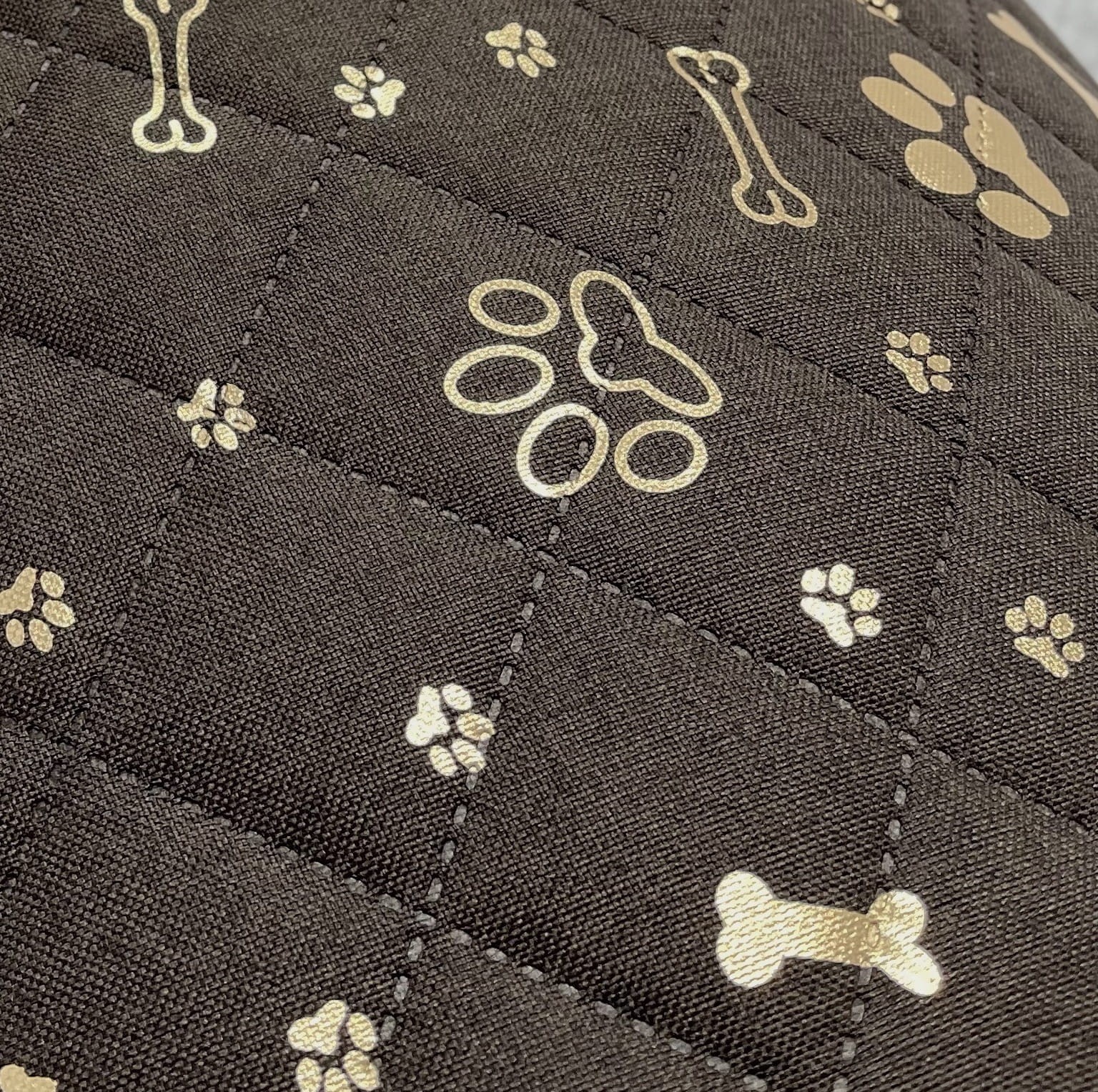 ⭐ DOGI Materiał obiciowy wodoodporny, pikowany ultradźwiękowo. Mieniące się złote kostki i ciapki psie - tkanina prezentuje się rewelacyjnie. Idealna np. na legowiska dla zwierząt, maty czy odzież dla piesków.