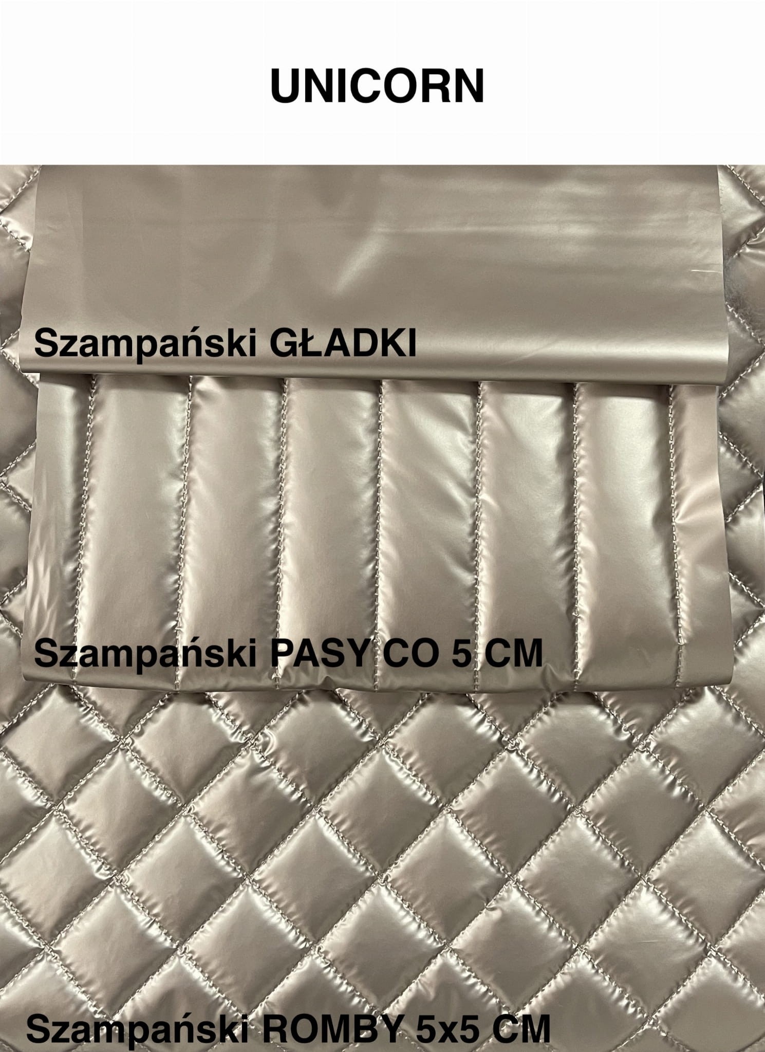 ⭐ UNICORN Tkanina jest wodoodporna i wiatroszczelna. Pikowana metodą ultradźwiękową na ocieplaczu. Wierzchnia warstwa jest pokryta bezbarwnym poliuretanem (PU), co powoduje, że jest błyszcząca. W dotyku jest niezwykle miękka i delikatna, przy czym jednocześnie jest bardzo wytrzymała.